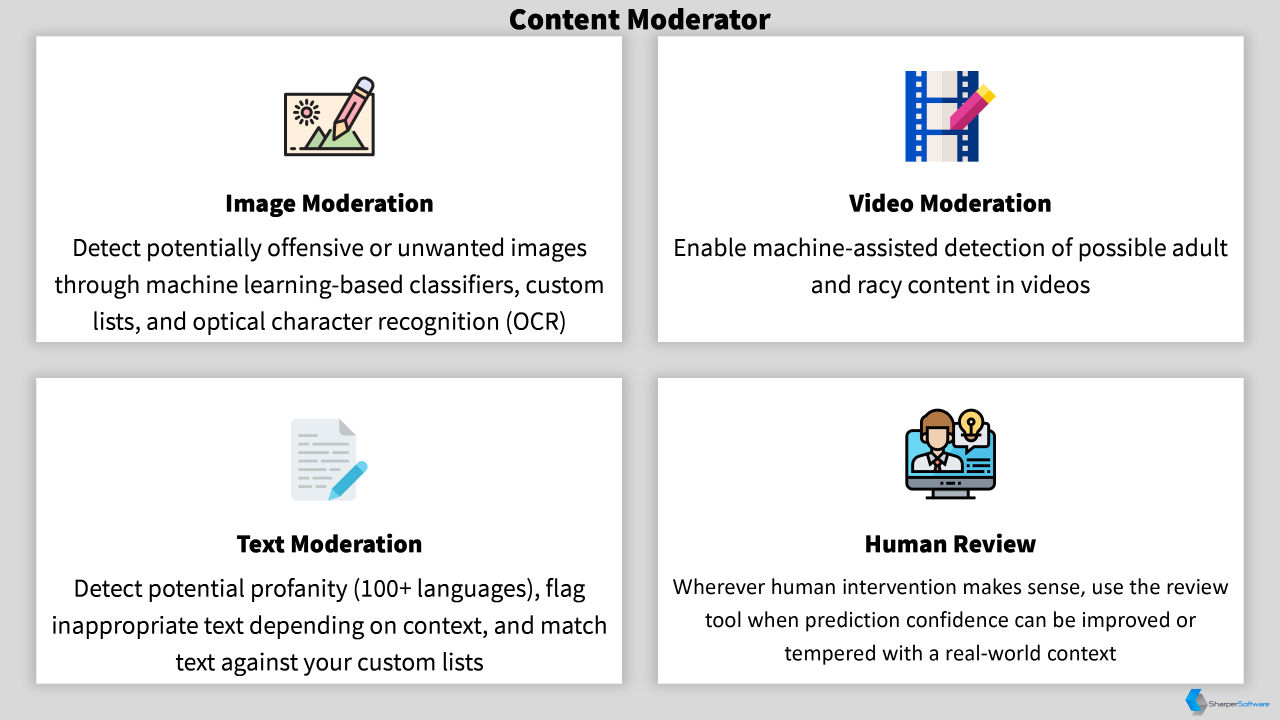 Reduce the headache of content moderation using artificial intelligence. Automatically control images and text that is marked as 'inappropriate' or that does not meet your country of operations rules and regulations, or those of not meeting your corporate values. | |